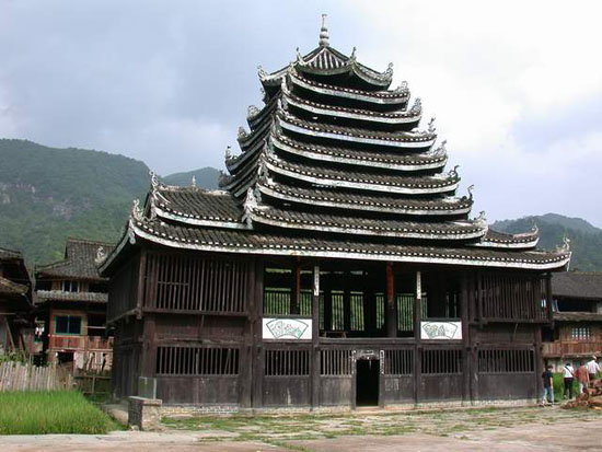 位于通道侗族自治縣坪陽鄉(xiāng)田心寨境內(nèi),始建于清順治年間,為侗族獨特建筑。方形二層樓閣,九層八柱,木結(jié)構。邊寬8米,高20米。頂蓋為八角形,上托葫蘆寶頂。封檐板與樓內(nèi)大梁彩繪民間圖畫,各檐翹角飾禽獸浮雕。底層設火塘,四周置木凳。二樓正面系活動板壁,可兼做戲臺。