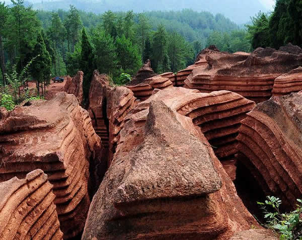 紅石林 告別船工后一切便突然安靜下來,過山谷的小路沒有人家,偶爾傳來幾聲清脆的鳥叫。穿過幾座隘口,峰回路轉(zhuǎn)后“石林”漸漸露臉,石頭的顏色是由灰白到棕紅,變幻而又使人聯(lián)想。間或一棵參天大樹,或是綠竹三兩棵,則又是另一番景致了。于高于低、于肥于瘦的石林,于石于樹、于濃于淡的色彩,顯得雄奇又雋秀,并透露出一種清靈飄逸。 這些石柱不但顏色各異,而且大小不等。有的高達七、八米,而有些則像半埋于地下的巨獸骨架。一位村民告訴記者,現(xiàn)在石林沒有以前壯觀,都長渣子(灌木)了。原因是由于山頂樹木減少,雨水將泥土帶下山,很多石頭都被埋在土下,后來這些地方都開墾了農(nóng)田,石林也被永久覆蓋。 由于泥土覆蓋,石林被切割成一個個小區(qū)域,有些隱蔽在果林中,而有些則像突然從天而降,散落田間。