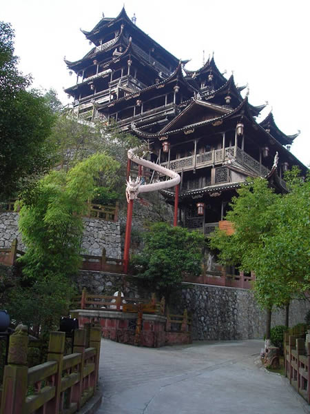 九重天 九重天世襲堂是土家風情園的精華和靈魂所在。該建筑由土家民間藝人李宏進設(shè)計,依80度陡坡而建,高48米,共9重12層,整個樓房全部用木栓連接,沒有一顆鐵釘,堪稱土家族建筑史上的奇跡。2002年9 月22日,九重天吊腳樓被載入世界吉尼斯世界紀錄,認定其為目前中國最大、最高、最完美的木質(zhì)結(jié)構(gòu)吊腳樓。2001年4月6日,朱镕基總理視察土家風情園時,對九重天贊不絕口:“一批民間匠人能造出這樣輝煌的吊腳樓,而且還解決了力學的問題,真是不簡單。”清華大學著名建筑學家何重義先生說:“張家界土家風情園完全可以和蘇州的園林相媲美。特別是九重天世襲堂,猶如玉宇瓊閣,令人神往!”古人說,天有九野,地有九州,土有九山,山有九寨。古人又把九重叫做天,說天有九重,最上一重是上帝和君主居住的地方,所以我們叫它“九重天”。