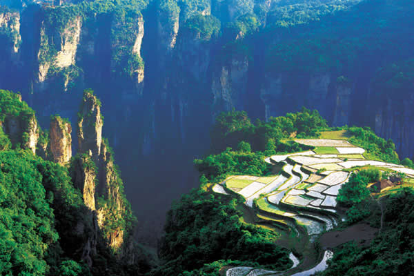 空中田園坐落在天子山莊右側(cè)經(jīng)老虎口、情人路方向兩公里處的土家寨旁,海拔1000余米。它的下面是萬丈深淵的幽 谷,幽谷上有高達數(shù)百米的懸崖峭壁,峭壁上端是一塊有3公頃大的斜坡梯形良田。田園三方峰巒疊翠,林木參天,白云繚繞,活像一幅氣勢磅礴的山水畫。登上“空中田園”。清風拂袖,云霧裹身,如臨仙境,使人有青峰鳴翠鳥,高山響流泉,身在田園里,如上彩云間”之感。