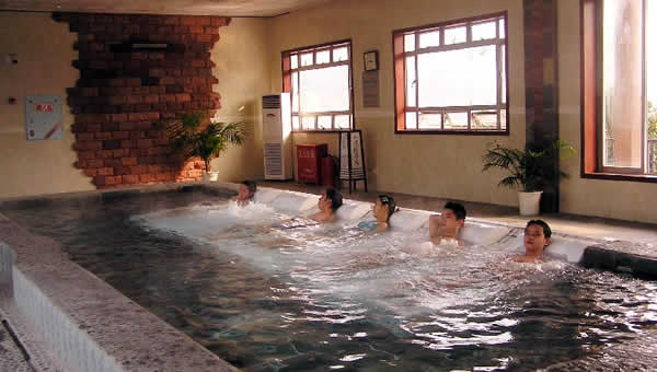 慈利縣江埡溫泉 最大的主溫泉池叫“同心泉”,形似一顆紅心,寓意同心同德,萬眾一心,眾志成誠(chéng)。同心泉可供200人同時(shí)共浴,水溫38-41度,可躺可坐,沐浴其中,仰望藍(lán)天白云,遠(yuǎn)眺雄山奇峰,伴隨著典雅的鄉(xiāng)村音樂,周身便覺溫曖如春、愜意萬分。