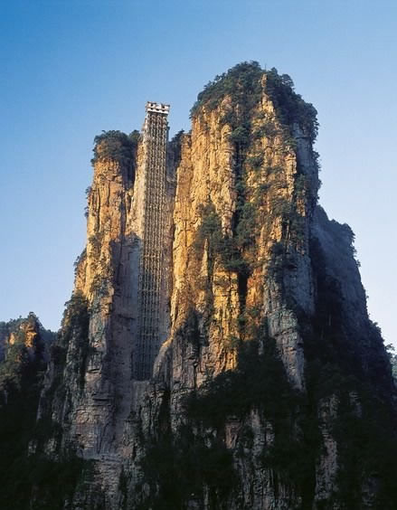 百龍?zhí)焯輬D片 2005年4月8日,張家界百龍?zhí)焯萑?hào)電梯通過驗(yàn)收正式投入運(yùn)營,這標(biāo)志著張家界核心景區(qū)旅游黃金周首條游客無須排隊(duì)通道誕生.。隨著張家界對(duì)景區(qū)核心袁家界的深度開發(fā)和金鞭溪與賀龍公園兩條紅色旅游線路的確立,選擇從金鞭溪乘百龍?zhí)焯萸巴医缂疤熳由劫R龍公園觀景的游客將越來越多,百龍?zhí)焯萑?hào)電梯開通后,它可為游客提供更可靠的交通保障,它將天子山、金鞭溪等精品游覽線連為一體,解決了多年困擾景區(qū)的交通瓶頸問題。游客乘百龍?zhí)焯,只要?jīng)過1分58秒鐘,便仿佛進(jìn)入如詩如畫的天上人間,欣賞有張家界“后花園”之稱的袁家界大峰林神奇美景。