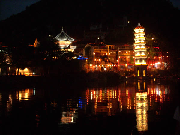 萬名塔 夜景 歷史沿革 萬名塔位于沱江沙灣北岸,與遐昌閣、虹橋相映。集中焚毀廢舊字紙的所在,三層,已毀。八十年代黃永玉召集當(dāng)?shù)厝四季柚匦逓槠邔,得到縣人民政府和各界人士的響應(yīng),并積極贊助資金,因捐款者甚眾,名為萬名塔。1988年10月建成,耗資5900元。塔內(nèi)外都添設(shè)了燈光,到夜間一片通明,和河兩岸一色的紅燈籠很相稱。塔內(nèi)壁上布滿游客題名,有的甚至位于兩米多高的墻上。 塔用青磚和混合沙漿以及鋼筋混泥土砌筑而成。塔為六方、七級,每層六個翹角,精美秀麗,且懸掛銅制風(fēng)鈴。塔高22.98米,一層直徑4.5米,向上每層直徑縮小0.3米。塔面裝飾雅致,塔身挺拔秀麗,宛若少女婷婷玉立于沱江之畔。一層有楹聯(lián)六副,皆為名人所題,或頌或感,風(fēng)格各異。如原縣長吳官林題聯(lián):"塔靜梧高凌空引鳳;河清岸曲流水藏蛟"。民主人士田鶴丹題聯(lián):"喜層層凌云高起;恰悠悠在水一方"。塔身映入沱江碧波之中,搖搖晃晃,顯得格外秀氣動人。