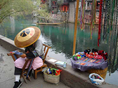 刺繡 刺繡。是土家姑娘在直紋平布上,按照布紋的經(jīng)緯和預先繪畫的花樣與底色不同的絲線繡成圖案。舊時姑娘們穿的繡花衣服,繡有服飾花邊、胸花、帽花,此外繡花枕頭、繡花荷包等也是精巧的手工工藝品。土家刺繡在配色上有自己的講究與習慣,一般選用青、藍、大紅等深色布料作底布,用淺色繡線制作圖案,或者相反,兩種用法的結果使繡品顯得質(zhì)樸逼真,色澤鮮艷,對比強烈。傳統(tǒng)圖案有“花開富貴”、“龍鳳呈祥”、“鴛鴦戲水”、“喜鵲鬧梅”、“松鶴同壽”等,分室內(nèi)、衣著、工具、行李裝飾等多種種類。在景區(qū),土家婦女邊繡邊賣的精美鞋墊,深受海內(nèi)外游客喜愛。