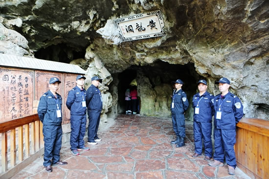 保護(hù)重于利用,開放服從保護(hù)。4月16日一大早,筆者在黃龍洞景區(qū)看到,一支英姿颯爽的保安隊伍邁向洞內(nèi)各自指定的崗位。